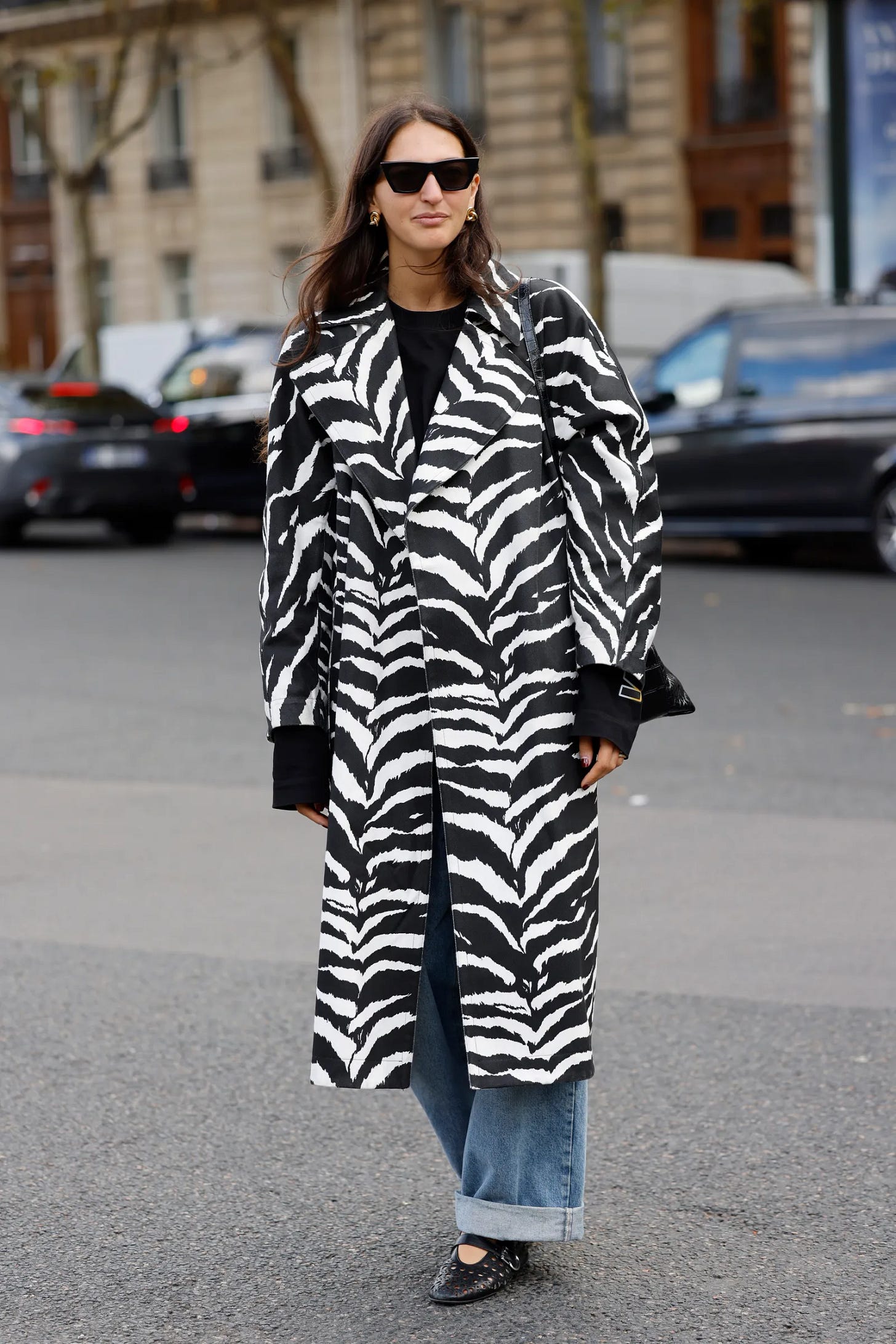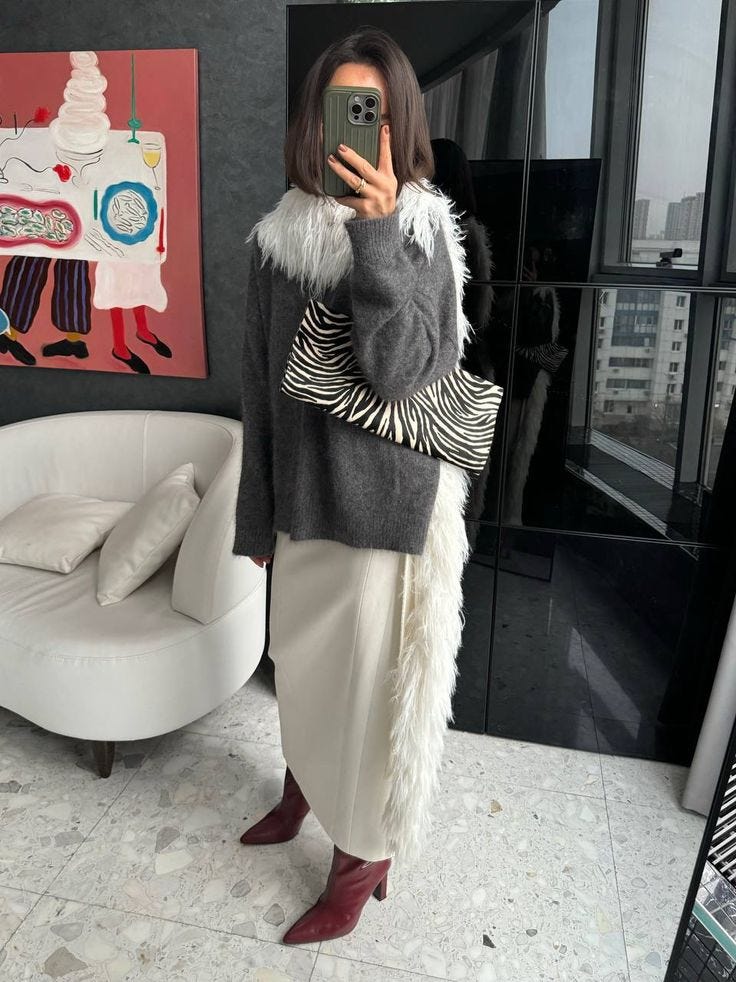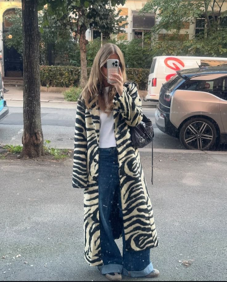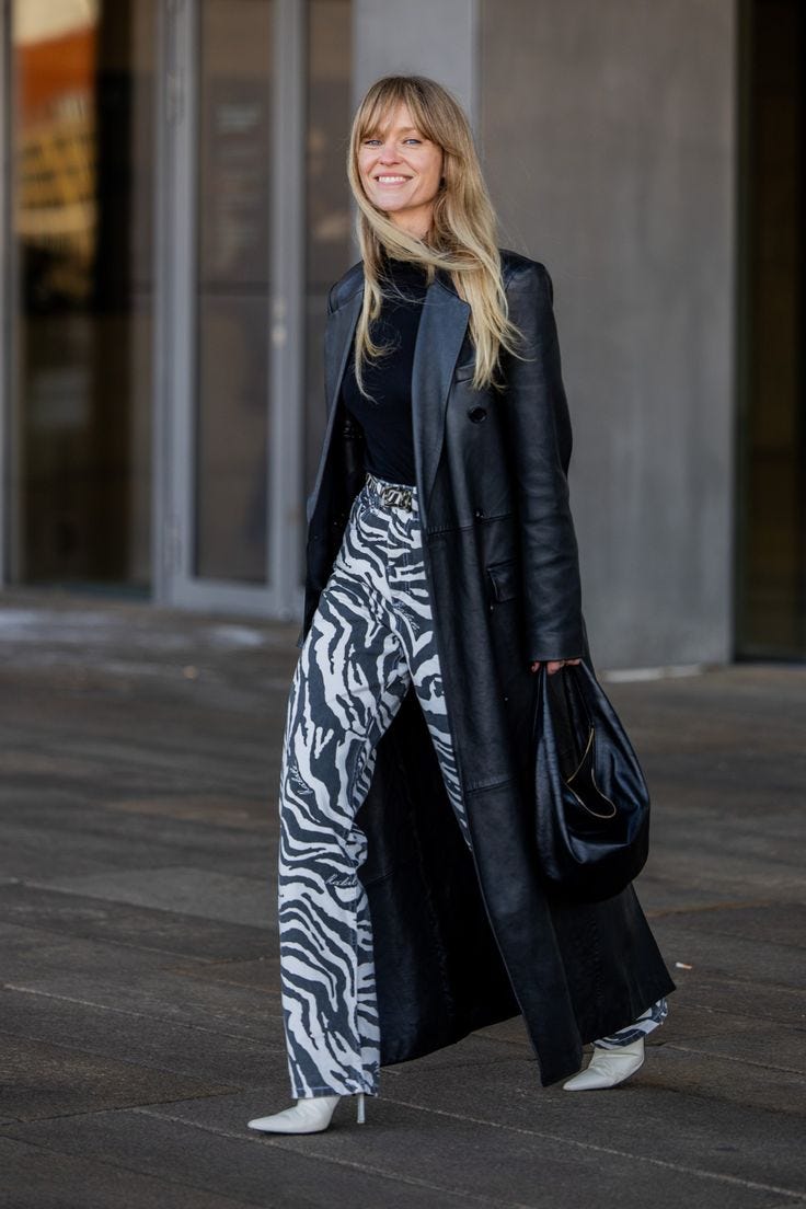 A zebra coat over a winter white dress, a structured longline coat with leather, or an accessory mixed in with other neutrals like cream or grey.